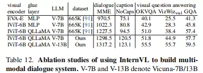 表 12 对比显示,InternViT-6B 相较于 EVA-E 具备更优的特征兼容性;而引入 QLLaMA 作为跨模态“胶水层”后,所有下游任务性能均获得明显提升,证明其在促进视觉-语言特征对齐方面的有效性。