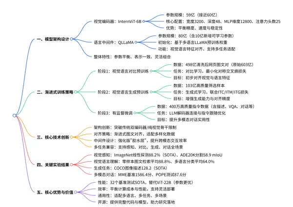 - 提出“大规模视觉编码器 + 语言中间件”新范式,首次成功实现 60 亿参数级别视觉编码器与大型语言模型(LLM)的高效对齐