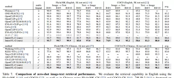 如表 7 所示,InternVL 在中英文双向图文检索任务中均达到 SOTA 水平。其中,InternVL-G 引入 QLLaMA 后进一步提升了匹配精度,平均性能达 88.8%,验证了渐进式训练策略的有效性。
