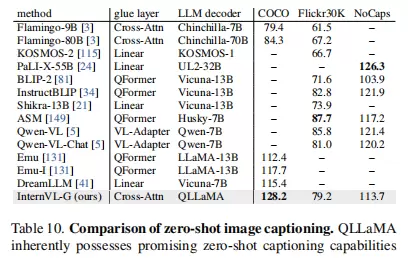 根据表 10 结果,InternVL-G 在 COCO 数据集上的零样本图像描述得分为 128.2,大幅领先现有方法;同时在 Flickr30K 和 NoCaps 上也表现优异,充分体现了其强大的生成能力。