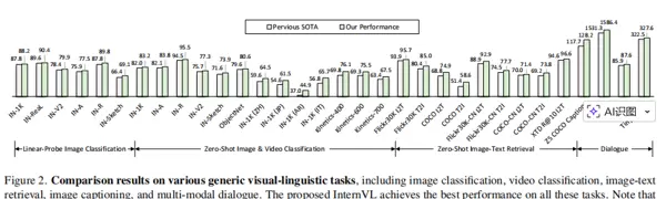 InternVL 在共计 32 个通用视觉语言基准测试上均取得当前最优(SOTA)性能,全面覆盖视觉感知、跨模态理解与生成、视频处理及多模态对话等多个维度。