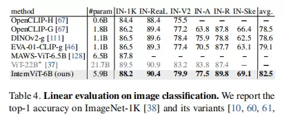 如表 5a 所示,在 ImageNet 及其变体数据集上的线性探测实验中,InternViT-6B 表现出卓越的视觉表征能力。即便未使用私有 JFT 数据集,其性能仍接近 ViT-22B 水平,展现出强大的特征提取潜力。