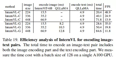 如表 19 所示,InternVL 在维持高性能的同时具备合理的计算开销。图像编码为主要耗时环节;相比 InternVL-C,InternVL-G 仅带来轻微计算成本增加,但性能显著跃升,为实际部署提供了灵活的选择空间。