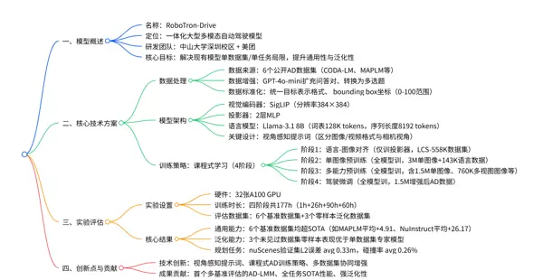 - 提出首个一体化自动驾驶多模态模型 RoboTron-Drive:支持多种输入格式,实现从感知到规划的全流程自动驾驶任务处理;