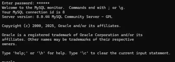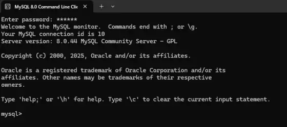 前提条件:确保MySQL服务已启动,输入正确密码后即可建立客户端连接。