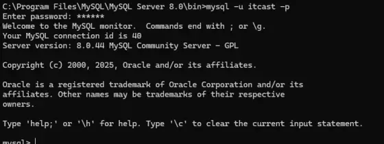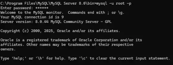 此命令表示以root用户身份连接本地IP(127.0.0.1)、端口3306上的MySQL服务器,随后将提示输入密码,验证成功后进入MySQL命令行界面。