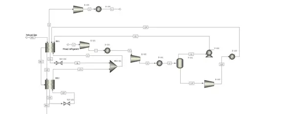 在Aspen Plus中模拟天然气液化过程,核心在于构建一个高效的混合制冷剂循环系统。该模型基于碳氢化合物与氮气的混合物,用于实现天然气的有效液化。整个流程本质上是一场精密的热量转移操作——目标是让甲烷在约-162℃条件下稳定转变为液态。
