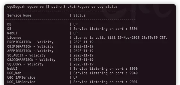 进入系统操作的第一步是切换至ugo用户,并进入指定的bin目录。
