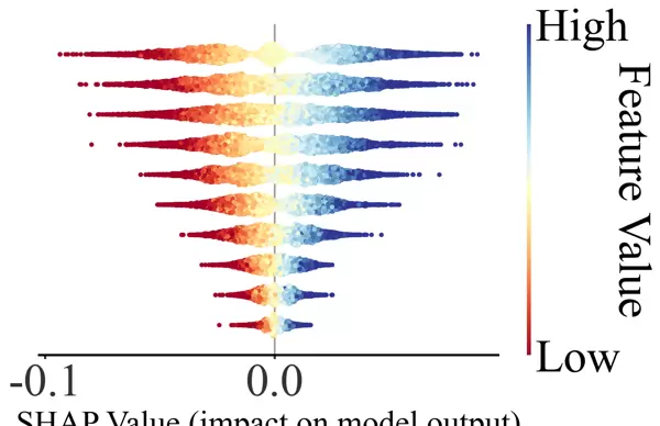 使用 SHAP 绘制的 beeswarm 图即可系统性地回应这些问题,清晰展示各特征的影响方向与强度。