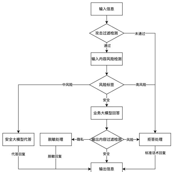 - 根据风险标签执行差异化应答策略:针对中风险内容,启用安全模型生成合规回复;对于高风险内容,则执行拦截并拒答;若内容被判定为安全,则交由业务模型生成正常答复。