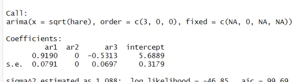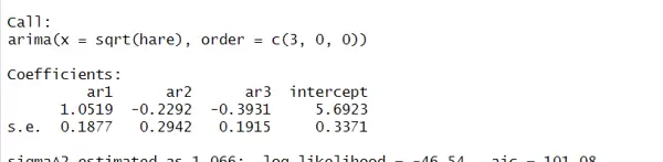 m1.hare = arima(sqrt(hare), order = c(3, 0, 0))