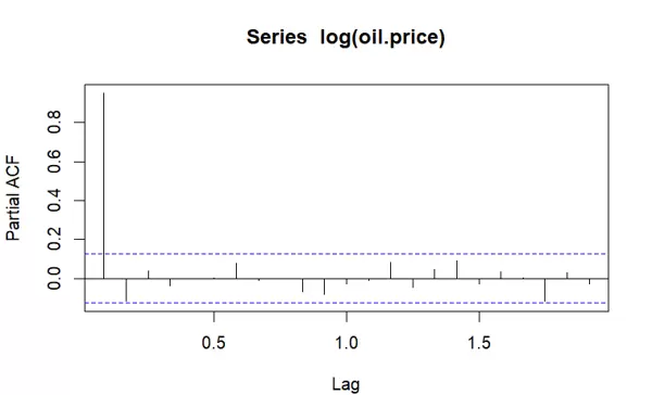 导入 oil.price 数据集,代表油价的历史变动情况。首先对数据取自然对数,以稳定方差并增强线性结构。