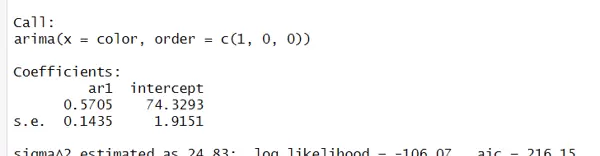 为实现 Ljung-Box 检验做准备,首先调用 acf(residuals(m1.color), plot=F) 获取残差的 ACF 数值而不绘图,提取其 acf 属性值。