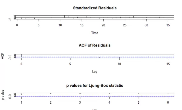 此图包含标准化残差、自相关函数图以及 p 值序列,帮助判断模型拟合效果和残差的随机性。