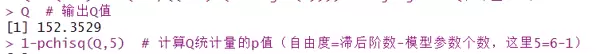 其中自由度取值为 5,对应滞后阶数减去模型参数个数(例如 6 - 1)。结果可用于判断是否存在显著自相关。