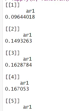 利用解析公式 sqrt((1 - (1 - φ) × φ^(2k2)) / n) 计算每个滞后阶数下 φ^k 的渐近标准差,作为构造置信区间的依据。通过 lapply 遍历所有 k 值并返回结果列表。