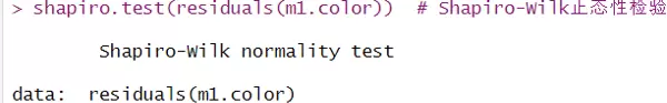 接下来执行 Shapiro-Wilk 正态性检验,调用 shapiro.test() 对同一模型的残差进行统计推断,获得检验统计量和 p 值,以量化方式评估正态性假设是否成立。