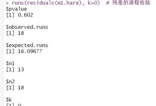 此外,针对 hare 数据集的平方根序列,拟合了一个 AR(3) 模型,并对其残差执行游程检验(runs test)以检测随机性: