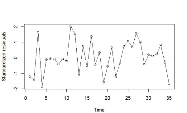 为进一步评估模型拟合效果,绘制标准化残差的时间序列图。通过 rstandard() 提取标准化残差,以 'o' 类型绘制点线结合图形,纵轴标注为“Standardized residuals”。同时添加一条 y=0 的水平参考线,便于观察残差是否围绕零值随机波动。