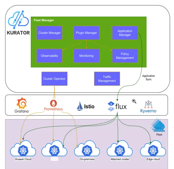 Kurator 引入“舰队”概念,将多个集群视为一个逻辑整体进行统一管控。无论是配置下发、策略执行还是故障响应,都可在 Fleet 级别完成操作,极大提升了大规模集群环境下的治理效率与一致性。