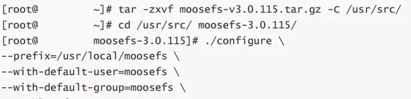 tar -zxvf moosefs-v3.0.115.tar.gz -C /usr/src/ cd /usr/src/moosefs-3.0.115/ ./configure \ --prefix=/usr/local/moosefs \ --with-default-user=moosefs \ --with-default-group=moosefs \ --enable-mfsmount
