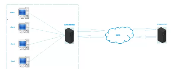 当客户端对外网发起数据请求时,该请求并不会直接到达目标网站,而是首先被发送到公司内部的一台服务器上。这台服务器作为中介,代替客户端向外部网络进行访问。