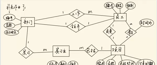 注:因一名员工可参与多个项目,故需建立“员工参与项目”联系关系;实习生仅参与一个项目,已在“实习生”关系中直接体现。