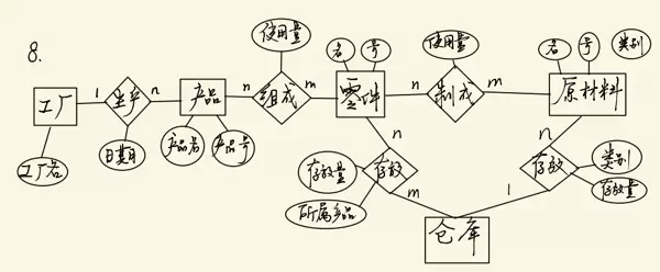 8. 某工厂生产多种产品,每种产品由不同零件构成,某些零件可用于多种产品。零件由不同材料制成,而不同零件可能使用相同材料。零件按所属产品分类存放于仓库,材料则按类别存放在不同仓库中。请画出产品、零件、材料、仓库之间的E-R模型。