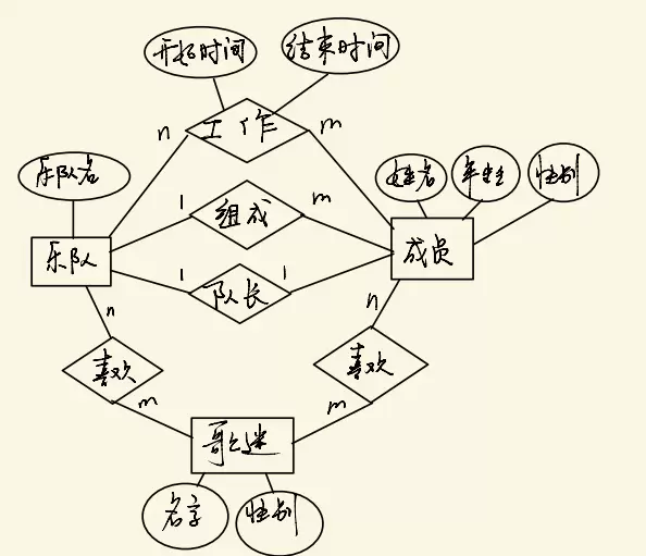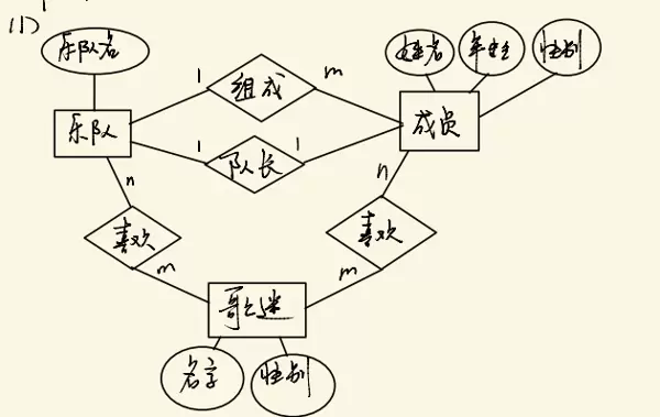 某数据库记录乐队、成员和歌迷的信息。乐队包括名称、多个成员、一个队长,队长也是乐队的成员。成员包括姓名、性别。歌迷包括姓名、性别、喜欢的乐队、喜欢的成员。