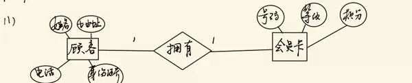 某商场可以为顾客办理会员卡,每个顾客只能办理一张会员卡。顾客信息包括顾客姓名、地址、电话、身份证号,会员卡信息包括号码、等级、积分,请给出该系统的E-R图。