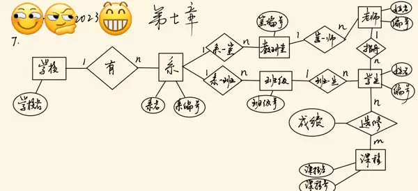 7. 某学院设有多个系,每个系下设若干教研室和班级。每个教研室有若干教师,其中教授和副教授可指导多名研究生。每个班级有若干学生,每位学生可选修多门课程,每门课程也可被多名学生选修,且每次选课对应一个成绩。请绘制该场景的E-R图。