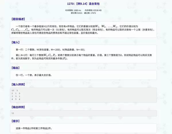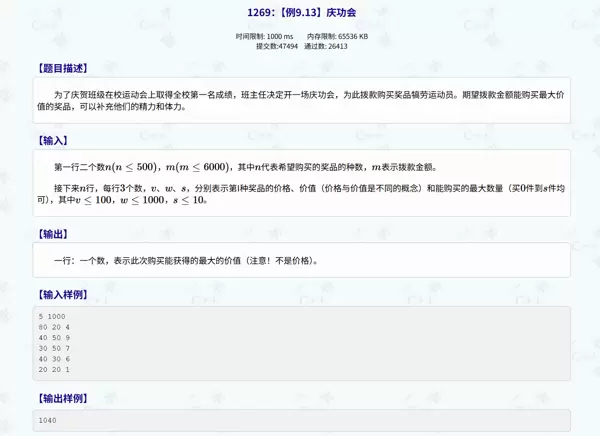 掌握各类背包问题的状态转移方程与遍历顺序,对于竞赛解题具有重要意义。其中,多重背包问题可以通过对物品数量进行拆分,转化为01背包的形式进行求解。