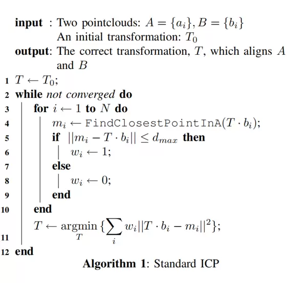 以下是 GICP 的主要步骤,以伪代码逻辑呈现,便于理解其实现机制。 输入: 源点云 $ P = \{p_i\} $,目标点云 $ Q = \{q_j\} $,初始变换 $ (R, t) $- 局部协方差预估: