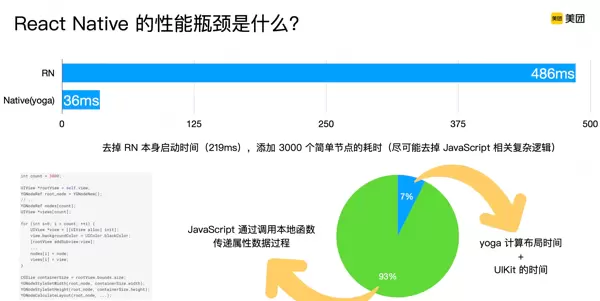 测试中,我们尽可能简化页面逻辑,并排除 React Native 启动阶段的时间开销。随后使用原生代码实现相同布局,仅调用 Yoga 进行布局计算,以此与标准 RN 流程进行对比。结果显示,两者耗时差距显著。由于布局算法一致、最终调用的 UI 接口也完全相同,因此可以推断:额外消耗的约 93% 时间主要用于将 JavaScript 层的数据跨线程传递至原生平台,即所谓的“属性转换”过程。