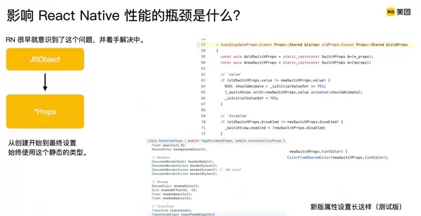 React Native 官方目前也在积极探索解决属性传递效率的问题。在其发布的一个实验性新框架中,采用了将 JSObject 直接转换为 C++ 中的静态类型(*Props)的方式。该方案在各个平台端直接使用这一转换后的静态类型,从而在整个流程中仅需创建一次 JSObject 字典结构。从初始化到最终属性设置,全程复用该静态类型,大幅减少了重复解析与转换的开销,使后续操作更加高效。
