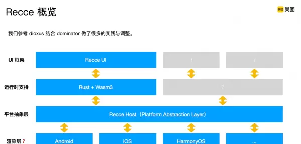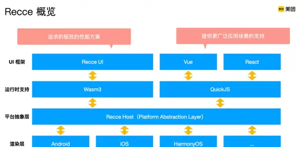 正因如此,我们将 QuickJS + Vue/React 的支持快速集成进来变得极为容易。同时,Recce-js 能够显著提升线上以 JavaScript 为主导的前端页面运行性能。鸿蒙系统的适配工作也因此大幅简化,所需人力投入远低于数千人日级别。最关键的是,未来若需更换更高性能的脚本引擎、编程语言或 UI 框架,均可通过此抽象层低成本实现。整个容器架构由 Rust 实现,保障了高效性与内存安全,同时也提升了整体系统的可扩展性与可维护性。