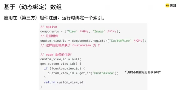 类似地,组件注册标识也可以由字符串改为整数索引。但由于原生组件的种类无法在编译期完全预知,因此至少需要在运行初期通过字符串查询一次组件信息。一旦获取成功,后续即可使用对应的索引进行快速匹配,从而保持高效的组件调用性能。