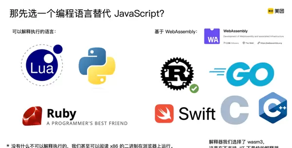 在剩余选项中,Wasm类解释器相比JavaScript引擎,在性能和安全层面具备显著优势。尽管其工具链和社区成熟度略逊于JavaScript,但仍处于W3C标准体系内,能够兼容H5和小程序环境,具备良好的跨平台能力。“晚饭想吃炸鸡”,即便“中午才开始杀鸡”,也来得及准备。