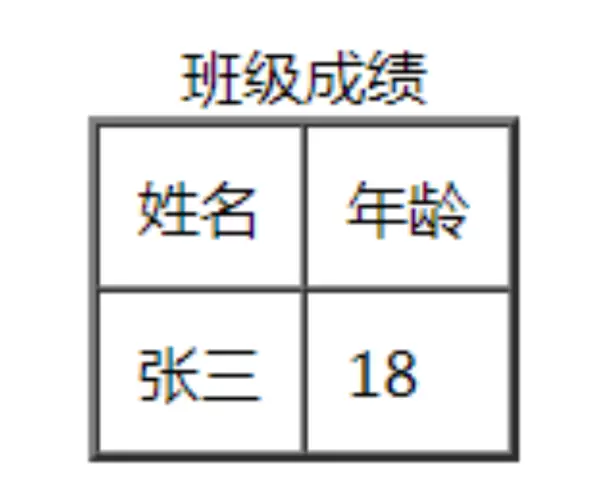 <table border="2" cellspacing="0" cellpadding="10"> <caption>班级成绩</caption> <tr> <td>姓名</td> <td>年龄</td> </tr> <tr> <td>张三</td> <td>18</td> </tr> </table>