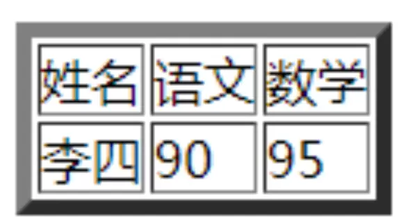 <table border="5"> <tr> <td>姓名</td> <td>语文</td> <td>数学</td> </tr> <tr> <td>李四</td> <td>90</td> <td>95</td> </tr> </table>