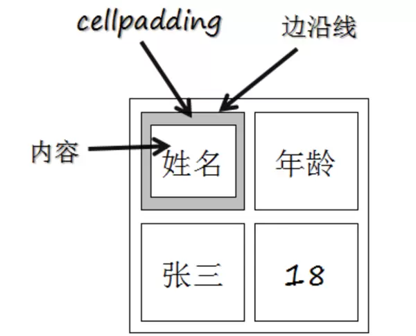 <table border="2" cellspacing="0" cellpadding="10"> <tr> <td>姓名</td> <td>年龄</td> </tr> <tr> <td>张三</td> <td>18</td> </tr> </table>