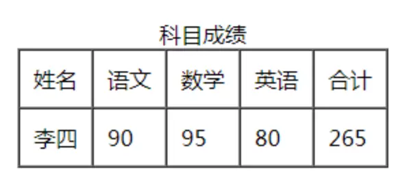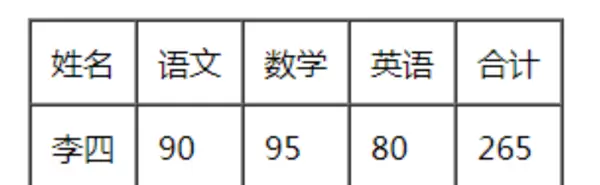 <table border="1" width="100%" height="200"> <tr> <td>姓名</td> <td>语文</td> <td>数学</td> <td>英语</td> <td>合计</td> </tr> <tr> <td>李四</td> <td>90</td> <td>95</td> <td>80</td> <td>265</td> </tr> </table>