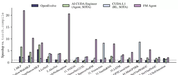 在 KernelBench 基准测试中,其表现更是遥遥领先。该基准用于评估 AI 自动生成高效 GPU(CUDA)内核代码的能力。结果显示,“伐谋”生成的代码相比 PyTorch 2.0 的核心编译器 torch.compile,在运行速度上实现了 2.08 倍至 20.77 倍的显著提升。
