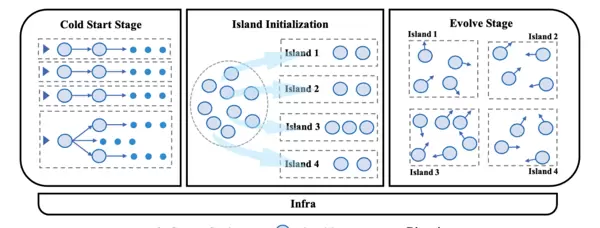 整个演化过程始于冷启动阶段。“伐谋”采用了聪明的初始化策略:允许注入人类专家编写的经验代码,或借助 LLM 生成高质量的初始种群,从而提高起点效率。