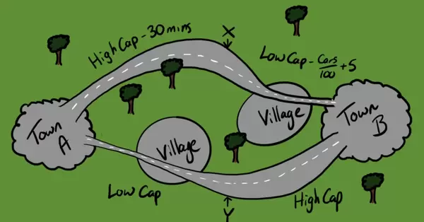 假设你是某城市的交通指挥官,需要引导 4000 辆车从起点 A 到终点 B。原本有两条通行路线,每条的行驶时间随车流量增加而上升。市政部门为缓解拥堵,新增一条“超级快速路”,理论通行时间为接近零。
