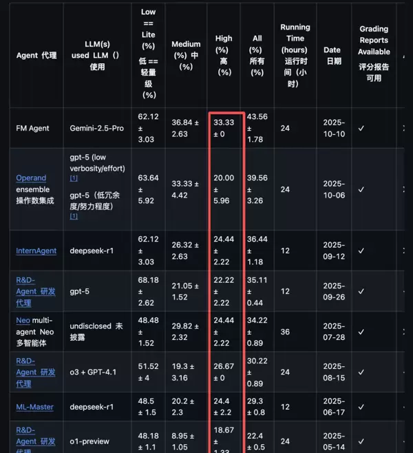 在 MLE-Bench(机器学习工程基准)榜单上,前列长期被微软、DeepSeek 等大厂的 Agent 占据,竞争激烈。而“伐谋”在此榜单中成功登顶,达到 SOTA 水平,Any Medal 率高达 43.56%,领先第二名整整 4 个百分点。