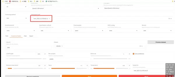 训练结束后,选取生成的微调 Checkpoint 进行性能评估。选择对应检查点并点击“开始”按钮,系统将运行评测并返回最终评价结果。