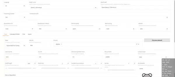 在基础设置中,选用 Qwen2-1.5 作为待微调的基础模型,其余参数保持默认即可。进入训练页签后,将训练数据集(Dataset)设定为 identiy,其他选项无需调整。