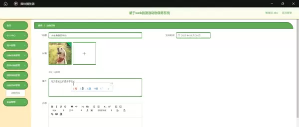 流浪动物模块:允许救助站上传动物详细信息,包括照片、发现地点、健康记录、是否绝育等,系统自动生成唯一编号与专属二维码,并关联后续领养流程。
