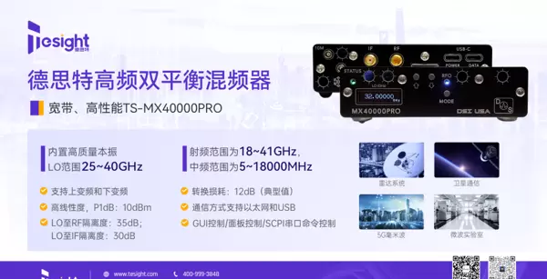 基于这一需求导向,德思特推出了一系列高性能混频器解决方案,其中TS-MX40000PRO作为一款通用型微波双平衡混频器,展现出卓越的技术整合能力。它不仅承担频率转换的基础功能,更集成了多项先进特性,构成一个高度集成的变频平台。